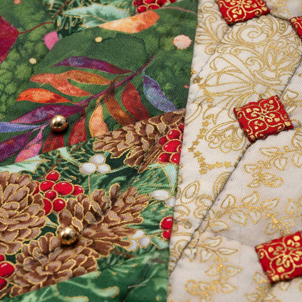 【キット作り方つき】松ぼっくりやリーフ柄の布を大きめに使用した、作りやすくて華やかなピースワークのツリー。“ 大人ゴージャス” なクリスマスを演出してくれそうです。