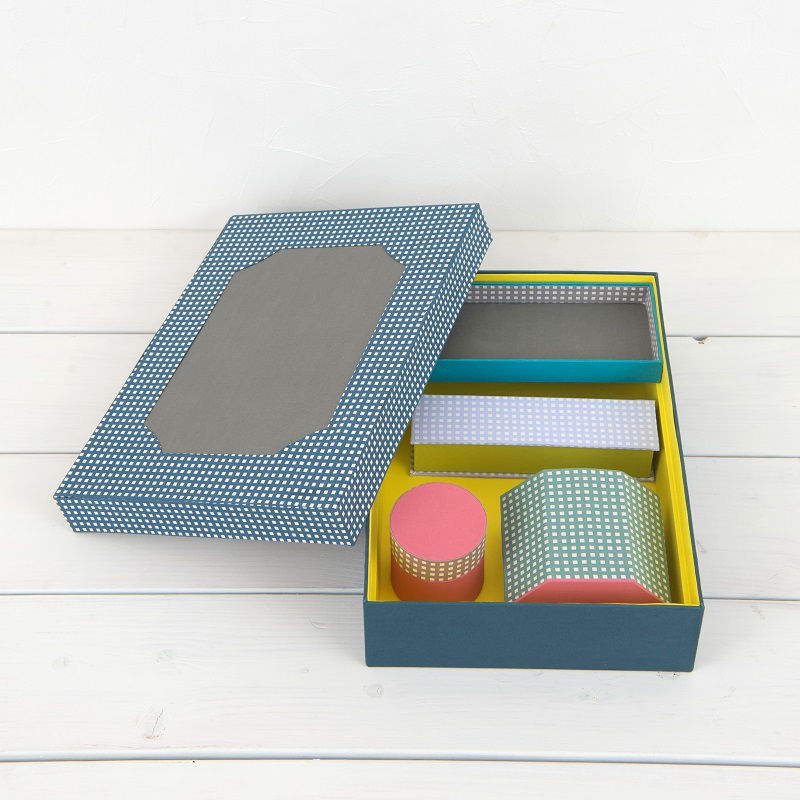 ベーシックな長方形・多面形・丸箱、蓋はブック型・つめかけ・かぶせ蓋と さまざまな形と蓋の作り方が体験できる5種類のキットです。 A4サイズのお道具箱に他の4種類がすっぽり入ります。
