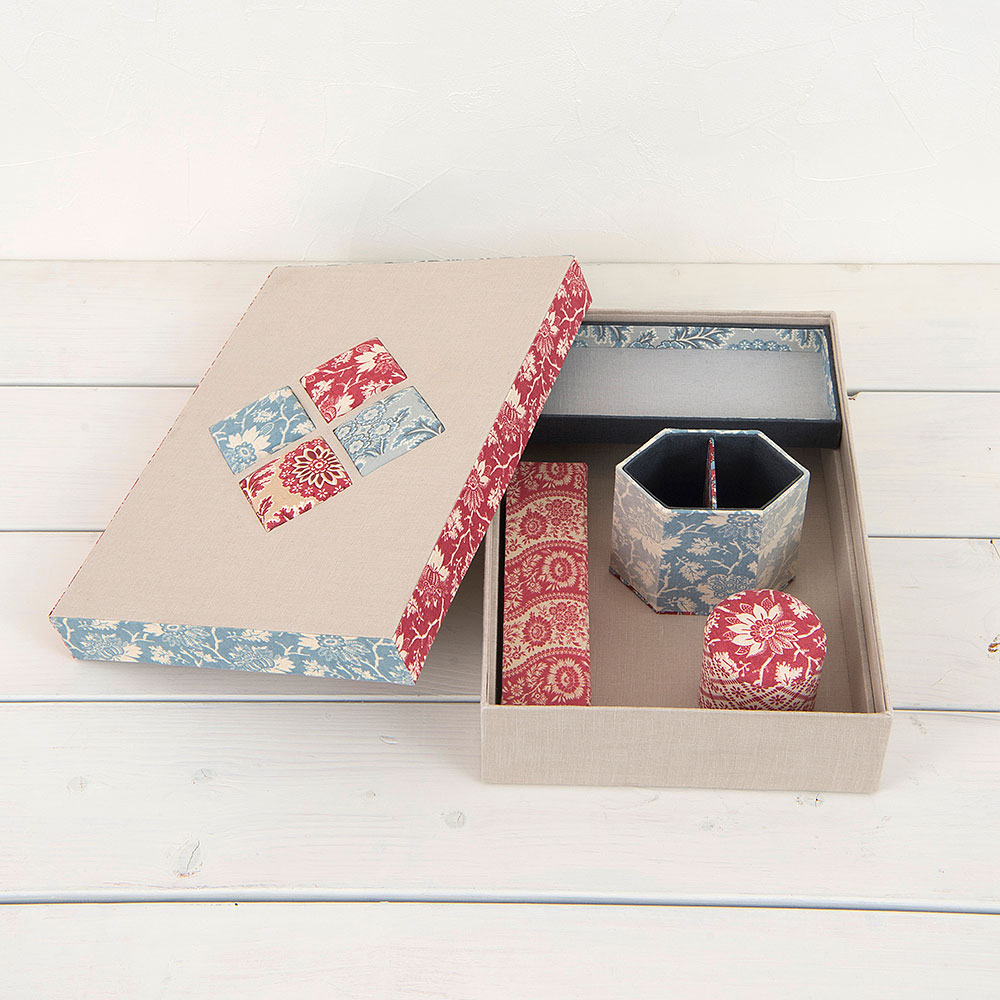 厚紙で組み立てた箱などに、思い思いの布や紙を貼って仕立てるカルトナージュ。