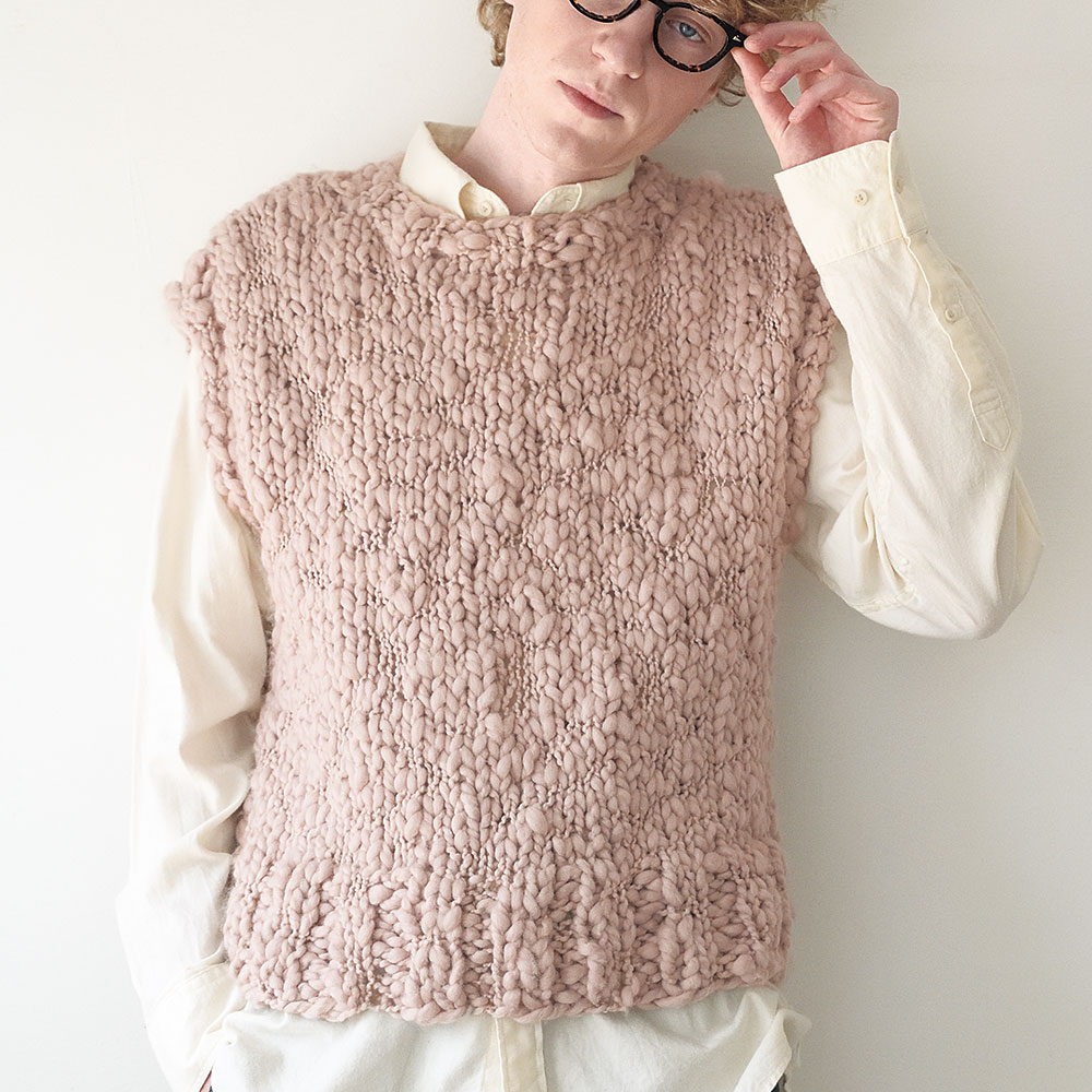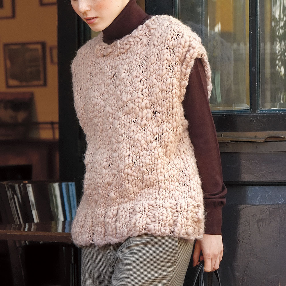 印象的な編み地の極太スラブヤーンのベスト。大きめサイズで編んだユニセックスなデザインは、大好きな人との共有もOK。ふわモコの肌触りに癒されるのは、老若男女人類共通の幸せです。きっと、気に入ってくれるはず。