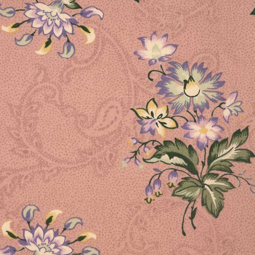 細かな植物模様入りのピンク地に、紫の花を描いたエレガントなプリント布です。抑えた色合いは、優しい印象のソーイングアイテムなどに。