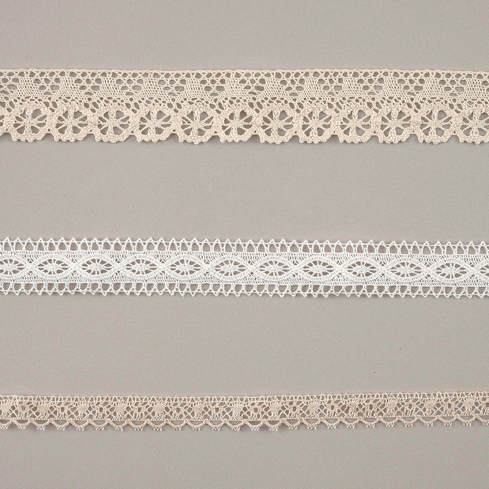 作品に使いやすいトーションレース。綿素材(生成り・オフホワイト)と麻混素材のレースが各1.5m入ったセットです。