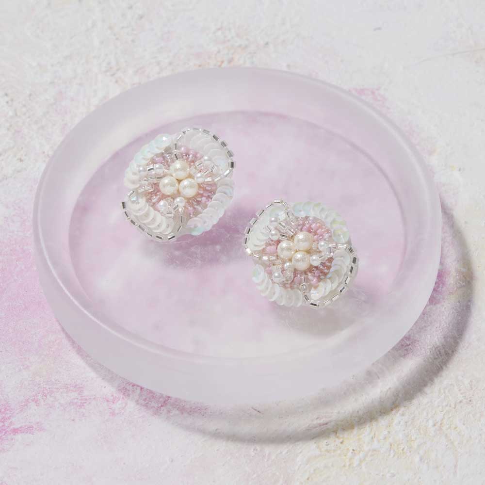 ビーズとさらにスパンコールやパールを留めて、優しいピンクカラーのイヤリングを作ります。
