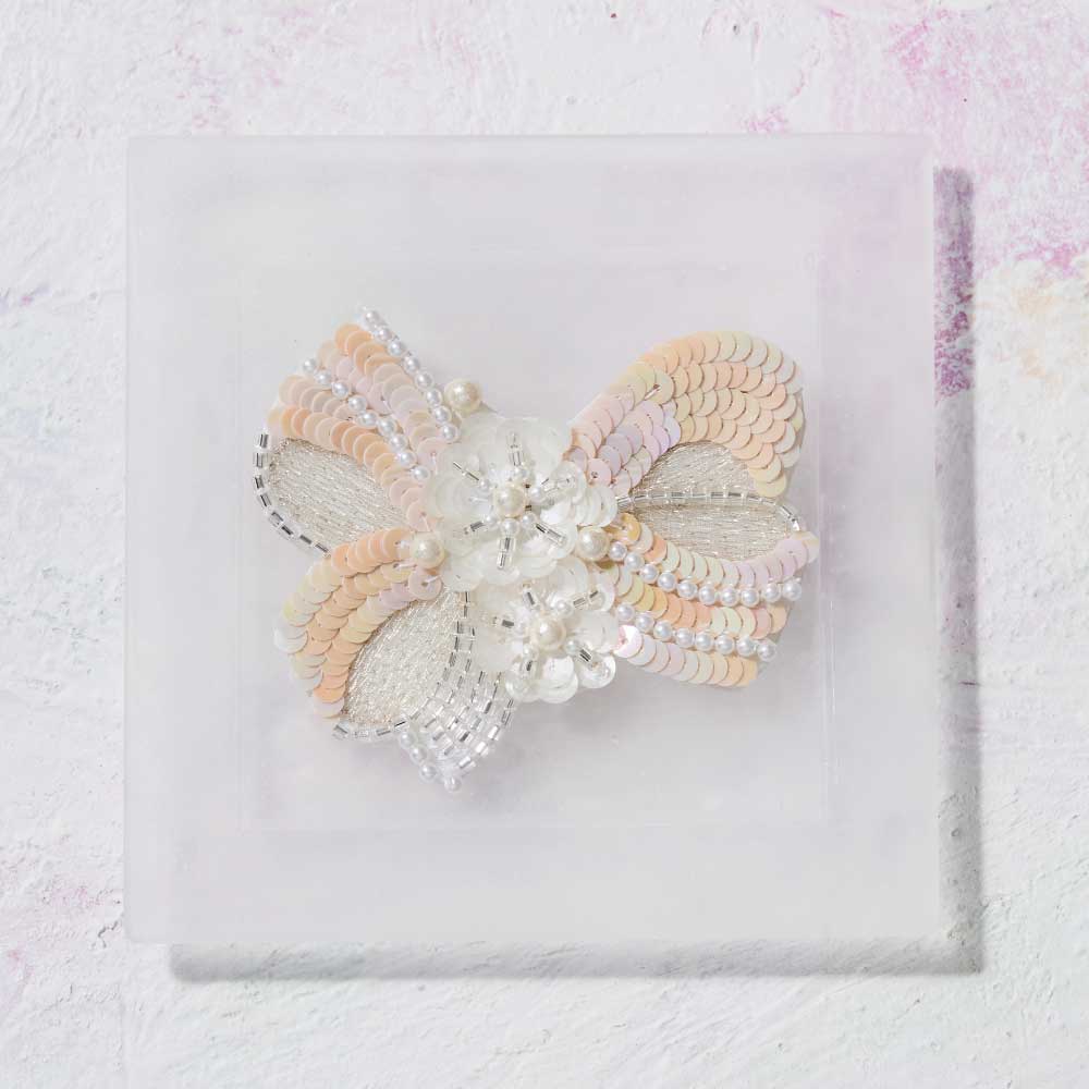 淡いオーロラカラーの、やわらかな印象のスパンコールをたっぷりと刺し並べ、アシンメトリーなリボンを描きます。銀糸のチェーンステッチで面を刺し埋めるテクニックも学びます。