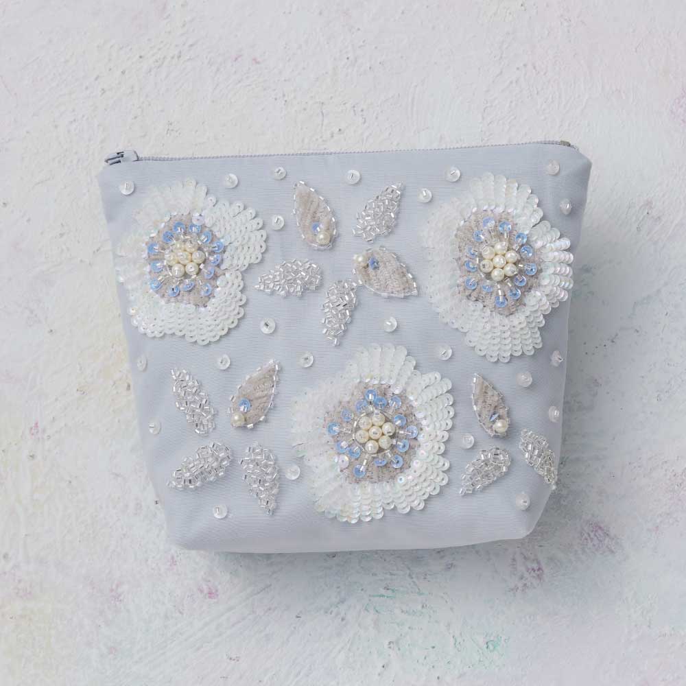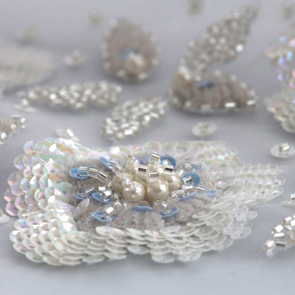 ビーズをランダムな向きに刺すヴェルミセルやモール刺しゅうをたっぷりとあしらって、オートクチュール刺繍らしい立体的な表現を楽しみます。