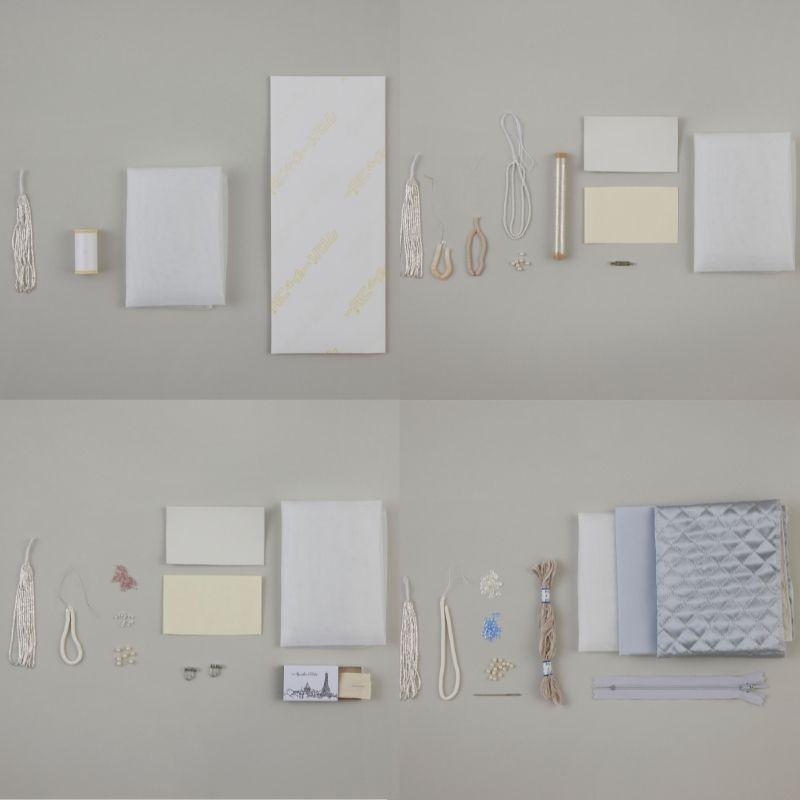 刺しゅうに必要な糸や、パールを縫い留めるビーズ針、モール糸を刺すシュニーユ針もセットされています。フランス・イタリアから直輸入の、日本ではめずらしいスパンコールなど、本場フランスで使われている材料をお届けします。