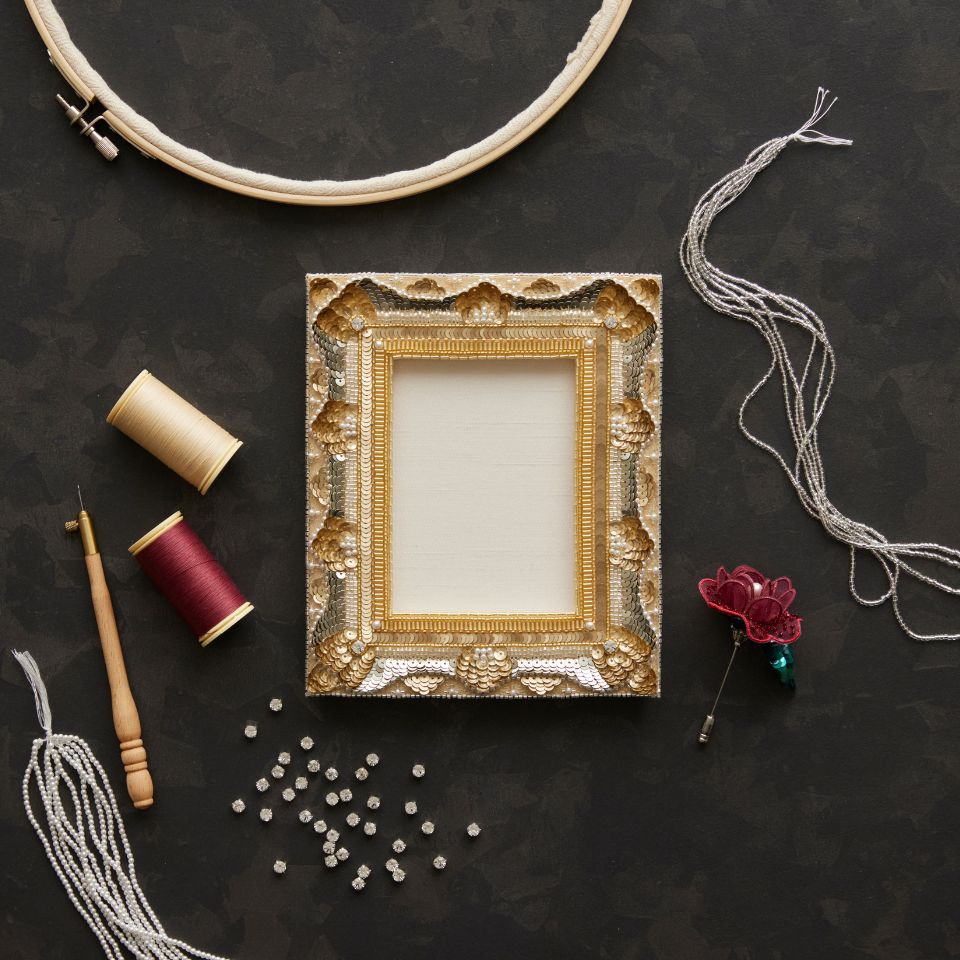 立体的で豪華なフォトフレームと繊細なお花のハットピンを作りながら、リュネビル刺繍の技法を深めていきます。