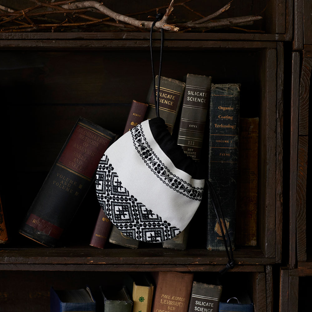 「もどこ」と呼ばれている基礎模様のひとつ”てこな”を総刺し、上部には蝶々とお花模様をボーダーに刺したフォルムが可愛いしずく巾着です。後ろ面は”てこな”をワンポイントに。