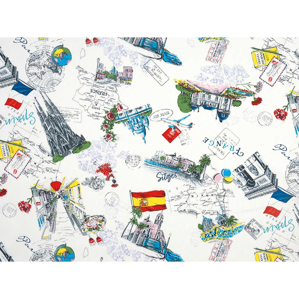 旅の思い出をテーマに世界の名所や街並みをプリントした、キルト作家・岡本洋子さんデザインの布です。バッグやインテリアなどにも。