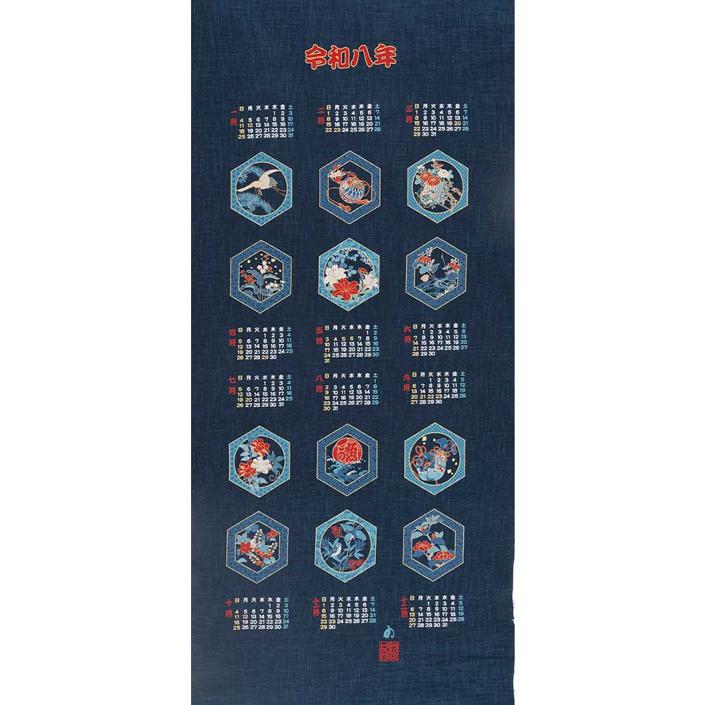 毎年好評の和調カレンダー!やや厚手のニュアンスある紺地に季節のモチーフを描いた、風情のあるパネルです。モチーフは約10.5×9cm。切り取ってコースターにしたり、6柄でそのままランチョンマットにすることもできます。