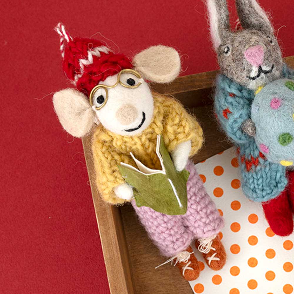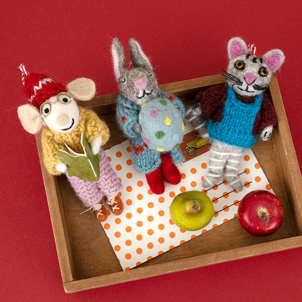 【完成品】ニットのウエアもおしゃれな、フェルト製のオーナメント3種です。それぞれ個性豊かな表情やファッションが楽しめます。クリスマスツリーなどに飾っても。