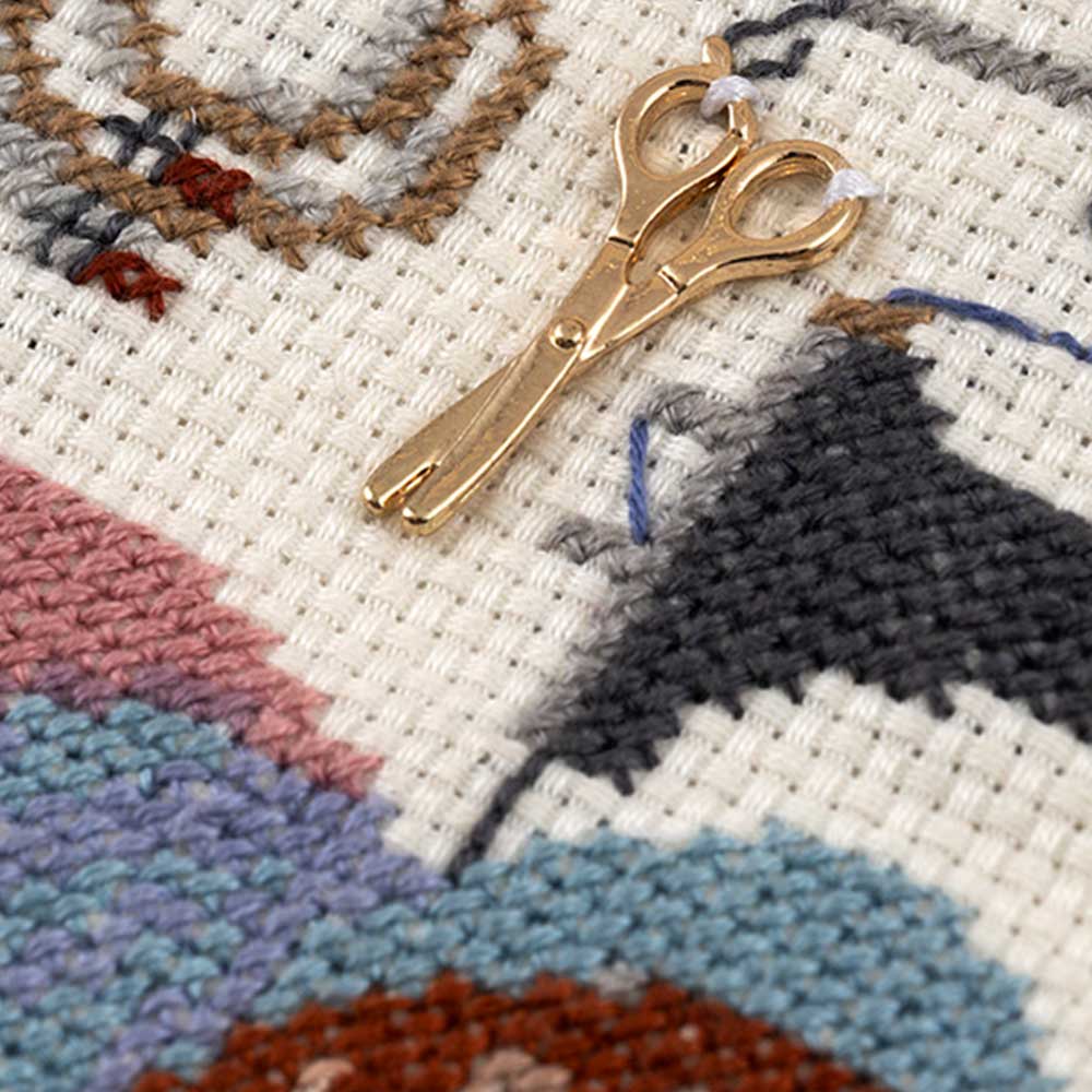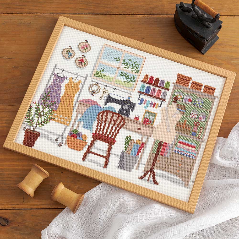 【キット作り方つき】【フレームつき】 ミシンやお気に入りの手芸材料が並ぶアトリエを多色のクロスステッチとパーツのトッピングで仕上げます。窓から光が差し込む、手芸好き憧れの風景がモチーフです。上級の方向け。