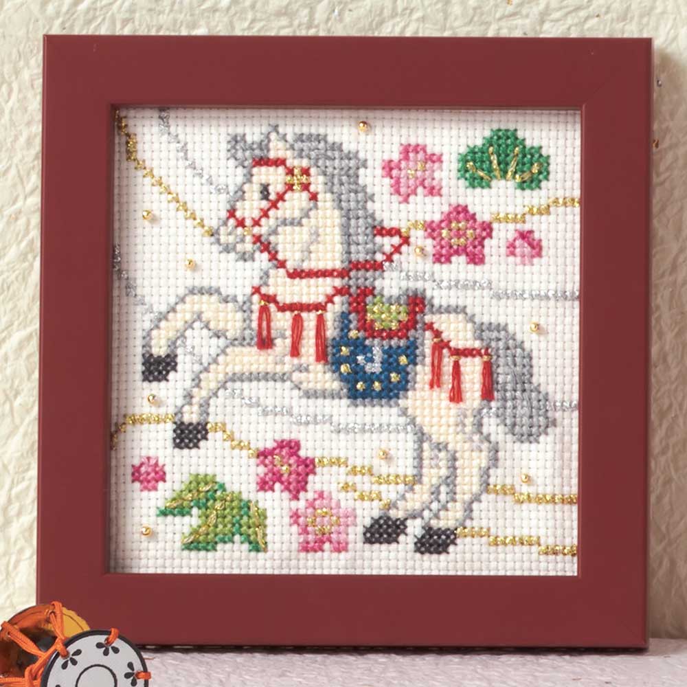【キット作り方つき】【フレームつき】 今にも動き出しそうな生き生きとした白馬をクロスステッチ。松竹梅のモチーフと赤いフレームもお正月のシーンにピッタリ。ラメ糸やビーズを使用し、おめでたい雰囲気を演出します。13×13の小さなサイズなのでクロスステッチをこれから始めるビギナーさんにもおすすめです。最後に赤い刺しゅう糸で馬の体に飾りつけをします。初級の方向け。