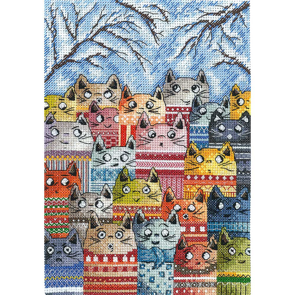 【キット作り方つき】 春を待ち望んで、身を寄せ合うニットのセーターを着た猫たちを描いた、カラフルでユニークなクロスステッチ作品です。中級の方向き。ロシア・Andriana社製(アンドリアーナ)。