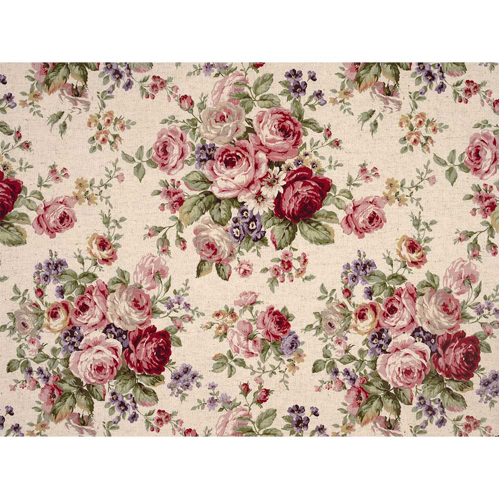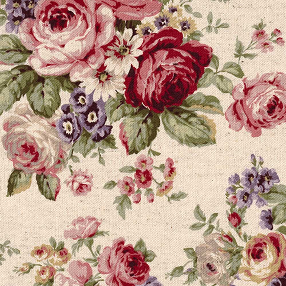 綿殻入りのナチュラルな綿麻地に、華やかなバラのブーケをプリントしたロマンチックな大柄布。やや厚手なので、バッグやインテリアなどに向いています。