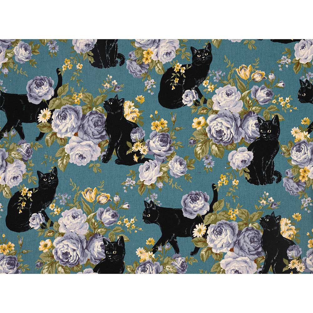 アッシュグリーンの地に、しなやかなクロネコと紫のバラを描いたシックなプリント布。バッグやインテリアなどにぴったりな、やや厚手の綿殻入り綿麻地です。