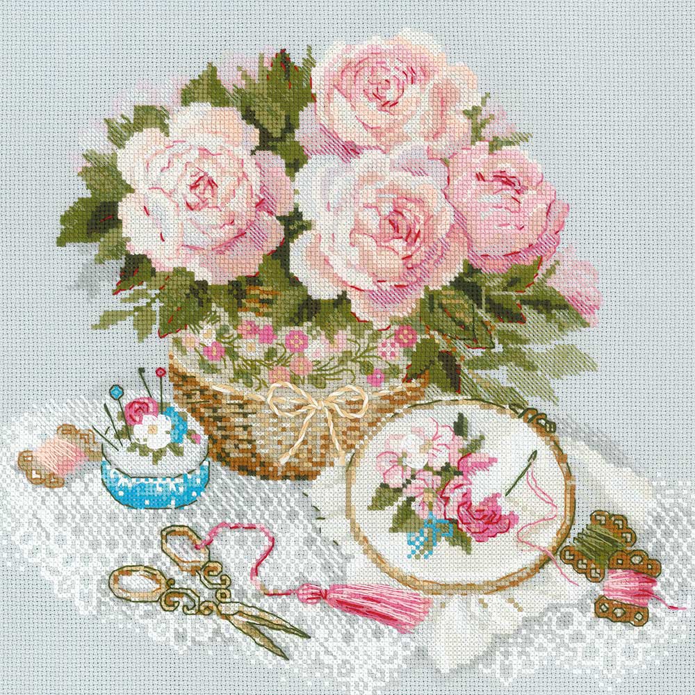 【キット作り方つき】 刺しかけの刺しゅう作品にハサミや、フラワーバスケットなど、刺しゅうを楽しむ優雅なひとときを描いたクロスステッチ作品です。上級の方向け。リトアニア・RIOLIS社製。