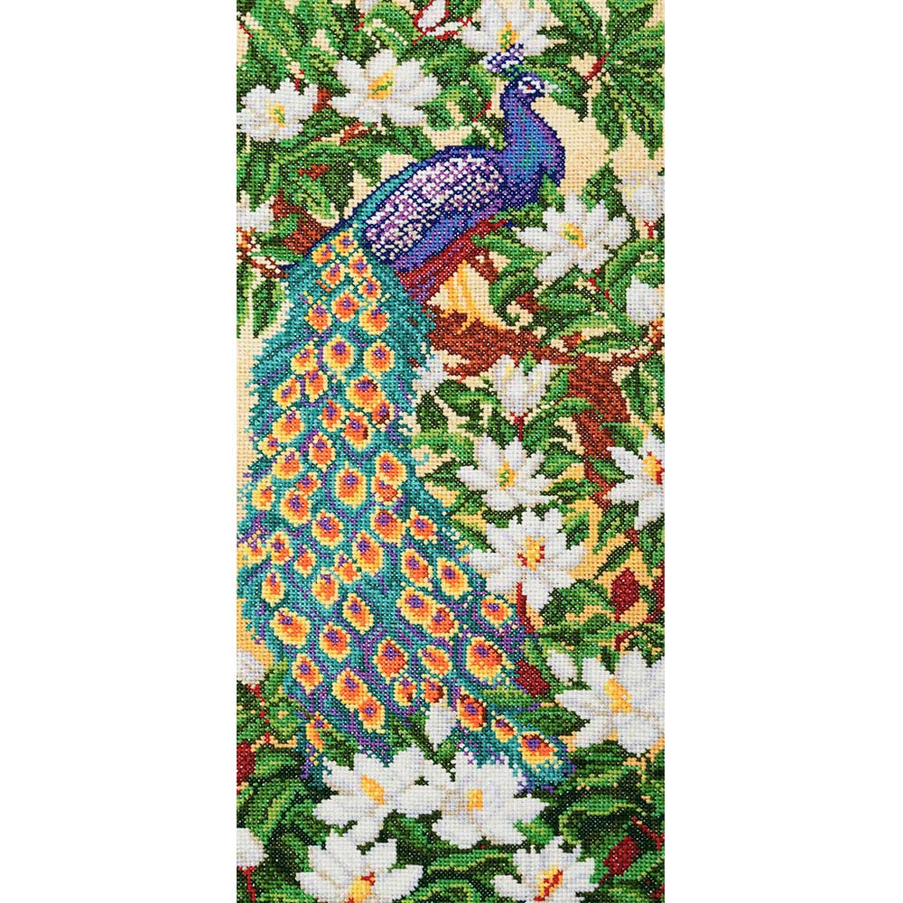 【キット作り方つき】 色鮮やかな孔雀と白い花をモチーフにした、エキゾチックなクロスステッチ作品です。溢れるゴージャス感で、お部屋の運気もアップしそう。上級の方向け。ウクライナ・VDV社製。