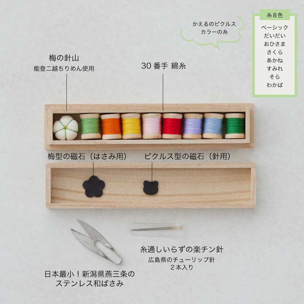 ピクルスをイメージした8色のカラフルな手縫い糸がセットされて、見た目も気分もほっこり。