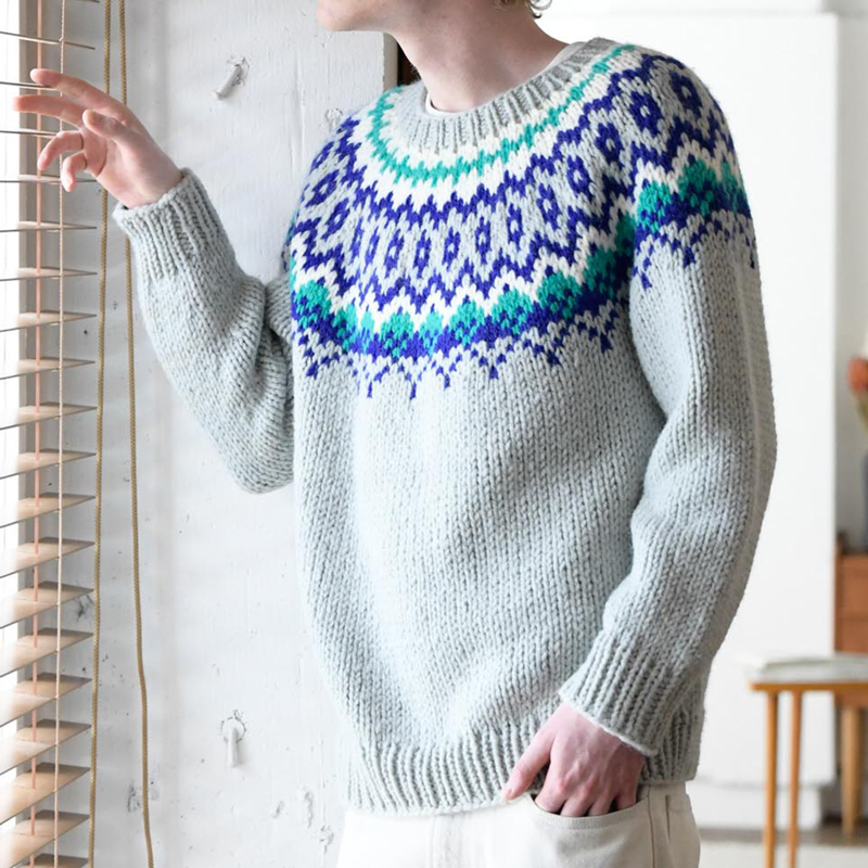 超極太糸で編む大胆な丸ヨーク。トップダウンの楽しさに乗ってぐんぐん編み進められます。寒色系にエメラルドグリーンが印象的。写真はLサイズですが、女性がオーバーサイズで着るのも可愛いです。