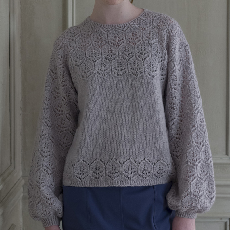「クチュール・ニット春夏7」のエレガントな半袖プルオーバーを長袖にアレンジ。六角形に囲まれた花のようなレース模様はそのままで、模様の配置や分量を工夫しました。