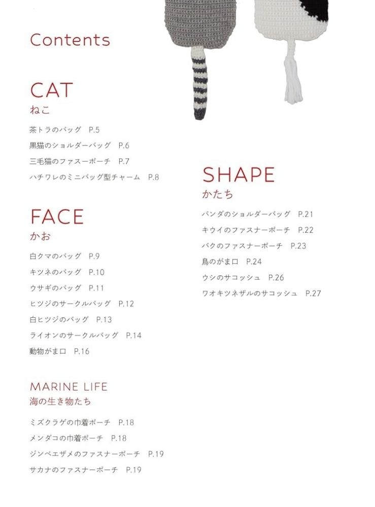 大人気のねこバッグをはじめとする、大人が持てるシンプルな動物バッグと、持ち歩いて癒される顔のついたあみぐるみタイプのポーチ、計25点を掲載。茶トラねこバッグの詳しい編み方レッスンと、フリンジや金具のつけ方などのポイントレッスンも充実し、初心者さんから中級以上の方まで楽しめます。