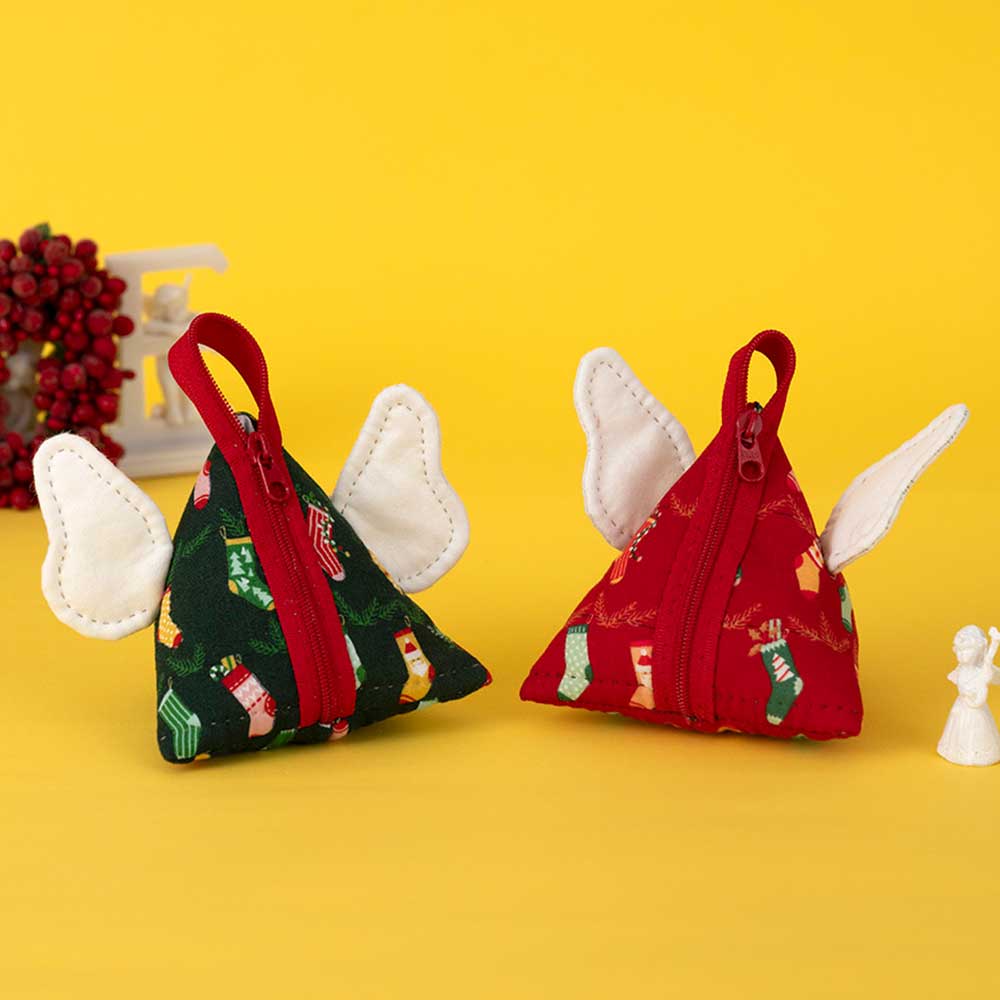 【キット作り方つき】1本ファスナーの一部を持ち手にした、クリスマスのソックス柄で作るテトラポット型のポーチセット。白い天使の羽が可愛いオーナメントにもなりそうです。