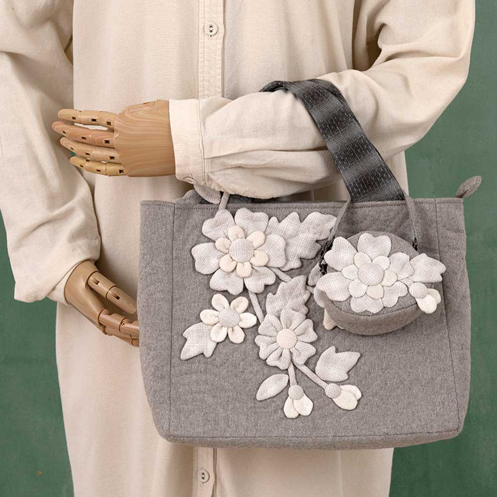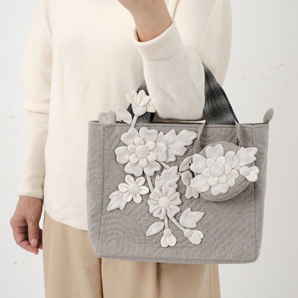 【キット作り方つき】白と淡いグレー系の先染め布を使い、大胆にデフォルメした花をアップリケ。チャームにもなるお揃いのポーチも作ります。装いの上品なポイントにもなりそうです。