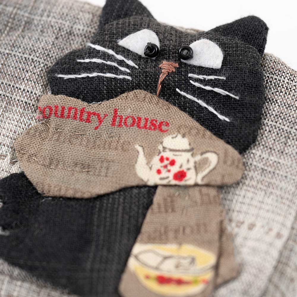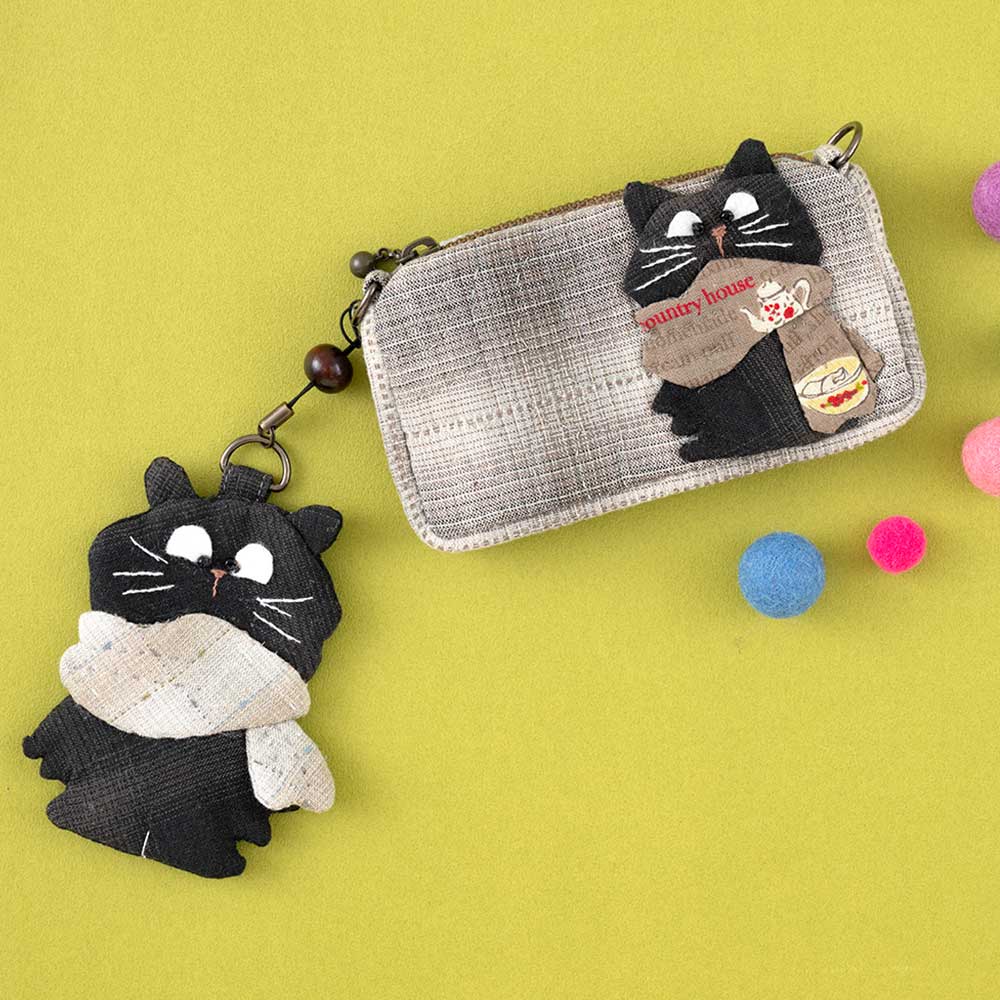 【キット作り方つき】チャームは兄、アップリケは弟。マフラーを巻いた、いたずらな黒ネコ兄弟をデザインしたミニサイズのポーチです。印鑑やピルケースにもぴったり。 チャームだけ外しても使えます。