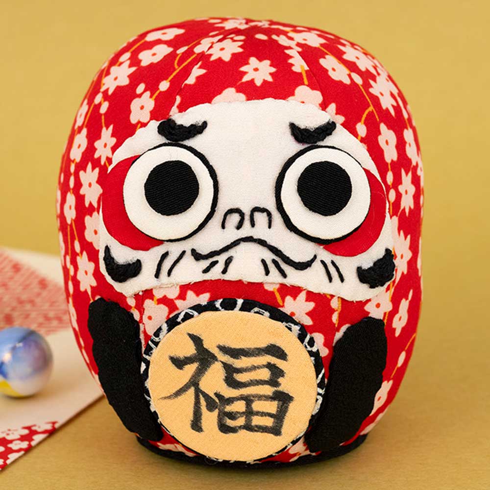 開運招福・家内安全・商売繁盛・必勝祈願と、様々な願いを込めて飾られるだるまを小さな置き飾りに。古裂の柄を生かして作り、福の字はペンで手書きします。