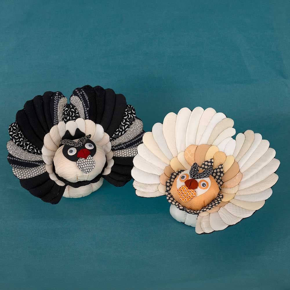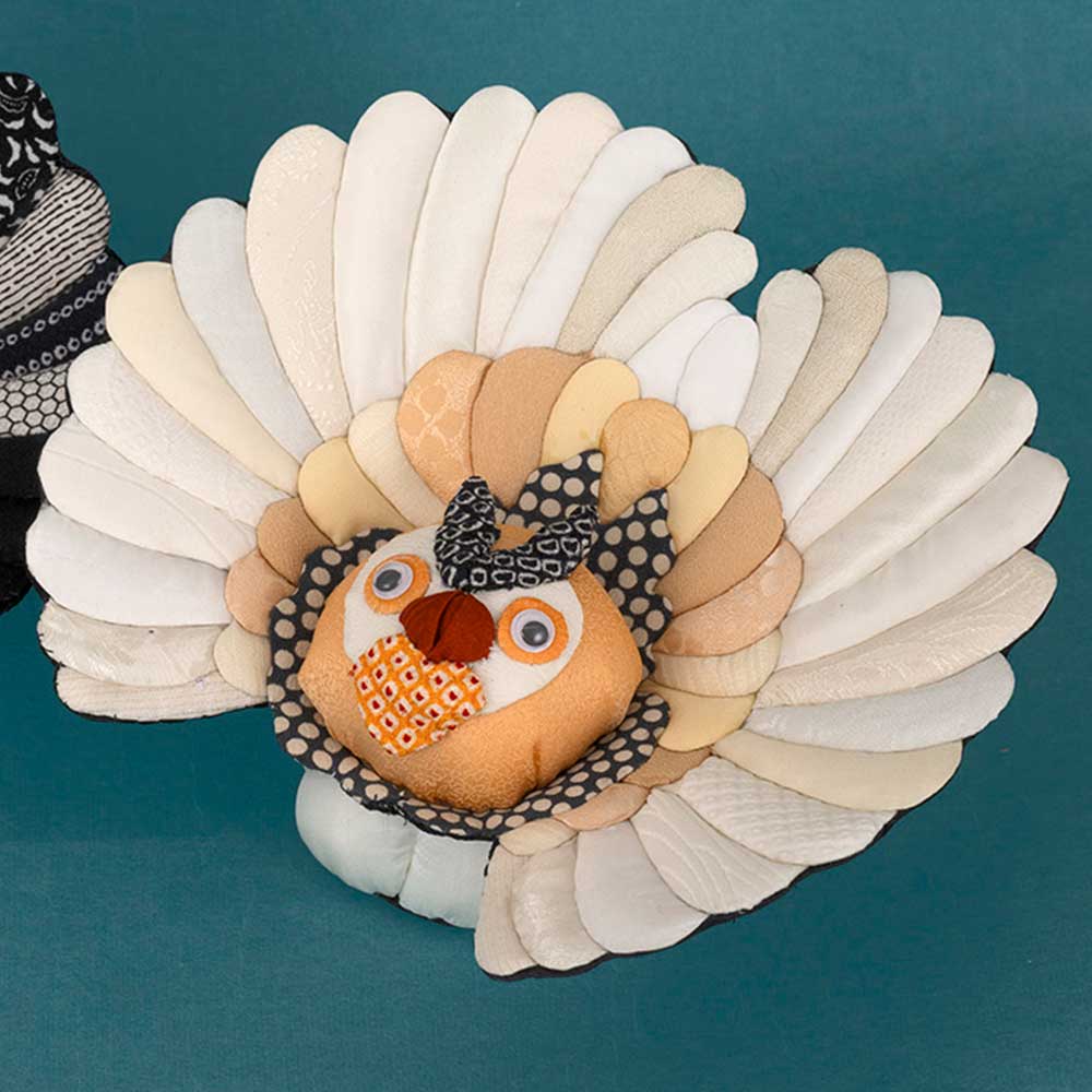 【作り方つき】【古裂】首が回る楽しい作りのフクロウ2 種です。置いたり壁に掛けたりして飾れます。“ 福来朗”“ 不苦労” で縁起よく。