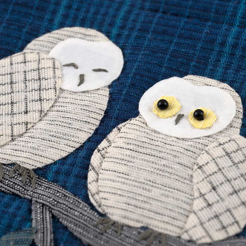 【キット作り方つき】山々を背景に、枝にとまる2羽のフクロウをアップリケ。遠近感のある夜の風景が神秘的です。空には銀の刺しゅう糸で星を描きます。