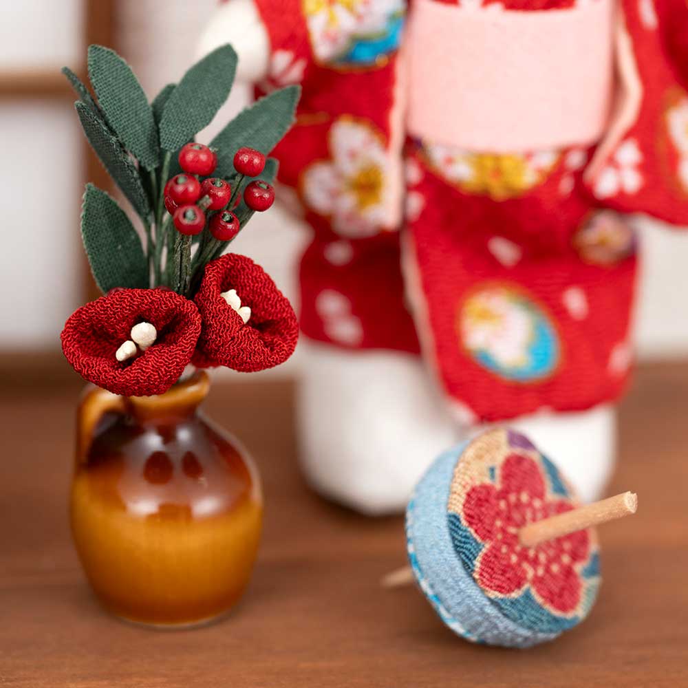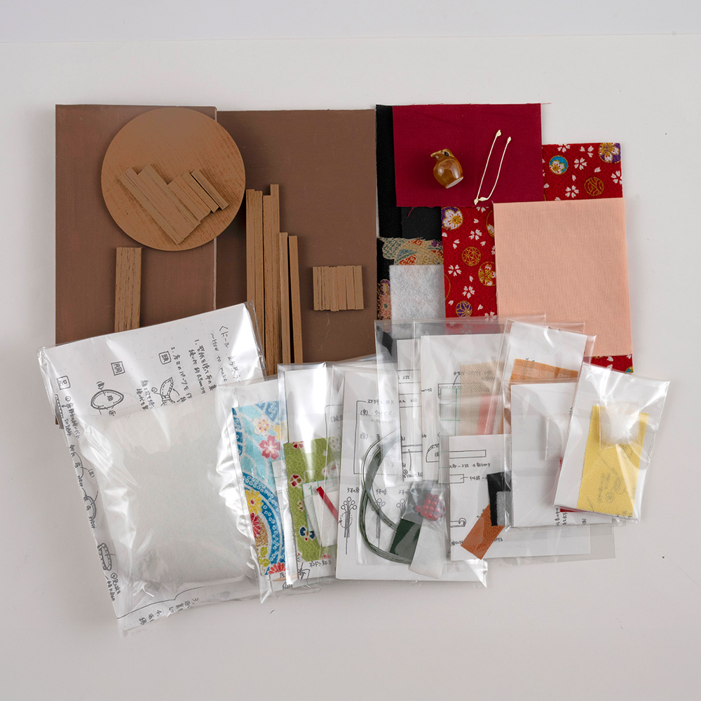 布、障子紙、接着芯(帯、うさぎの耳)、両面接着芯(南天用)、キルト芯、つめ綿、楊枝、リボン、ボタン、刺しゅう糸、厚紙、ワイヤー、ウッドビーズ、木材、障子紙、ミニチュア湯呑・花瓶、ペップ