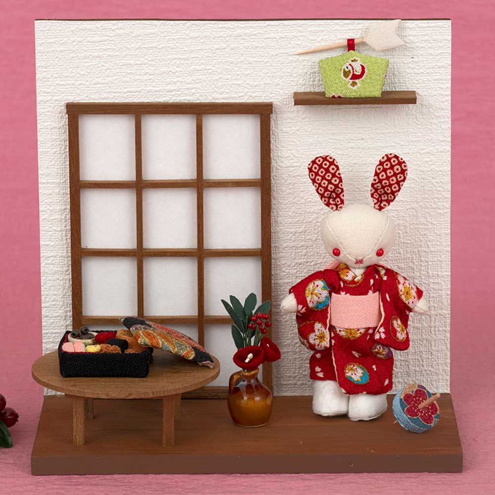 【キット作り方つき】ウサギの女の子がお正月を楽しむ和室を、可愛いミニチュアで表現しました。障子やちゃぶ台は、カ ット済みの木のパーツを接着剤で貼り合わせて作ります。