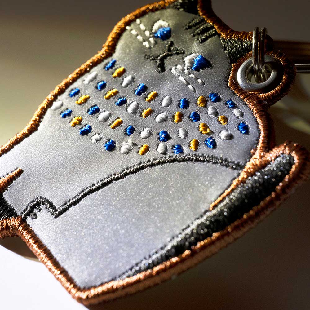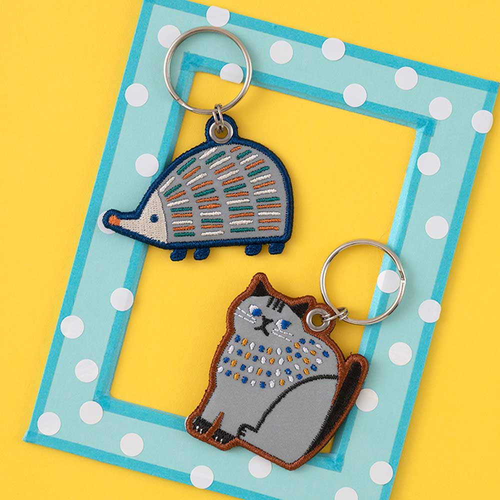 刺しゅうで可愛く表現した、動物デザインのキーリングを2 種セットで。バッグなどにつければ、ライトを反射して光るリフレクターになります。