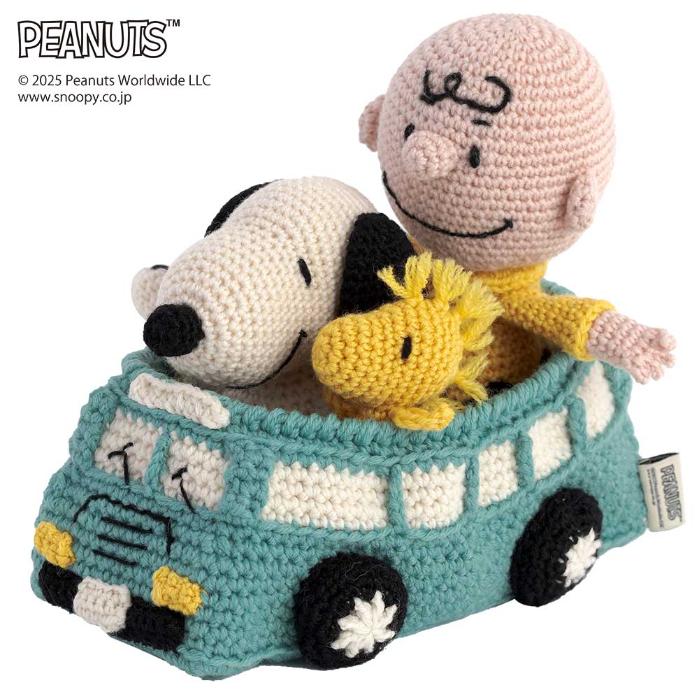 【キット作り方つき】バス型の入れ物とスヌーピー、チャーリー・ブラウン、ウッドストックが編めます。かぎ針編み中級の方向きです。