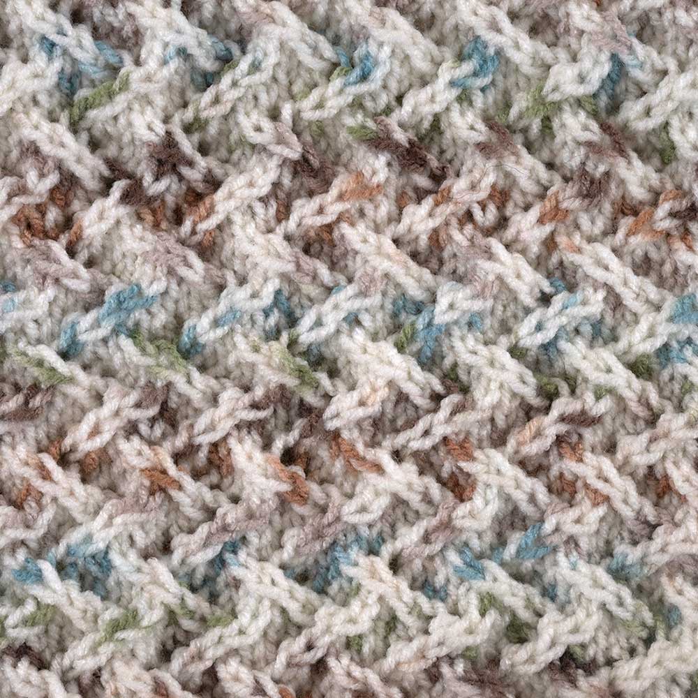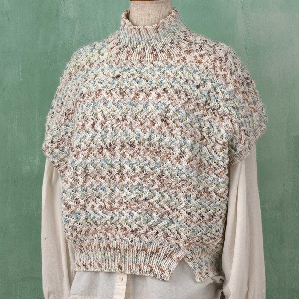 【キット・作り方つき】丸みを帯びたゆったりとしたコクーンシルエットが特徴のベスト。肩のラインが落ちており、体を優しく包み込むようなデザインです。首元はやや立ち上がったハイネックになっており、首元を暖かく保ちます。編むだけでドット模様の出る毛糸をシンプルな模様で編み上げることにより、大人っぽい作品に仕上げています。中級。