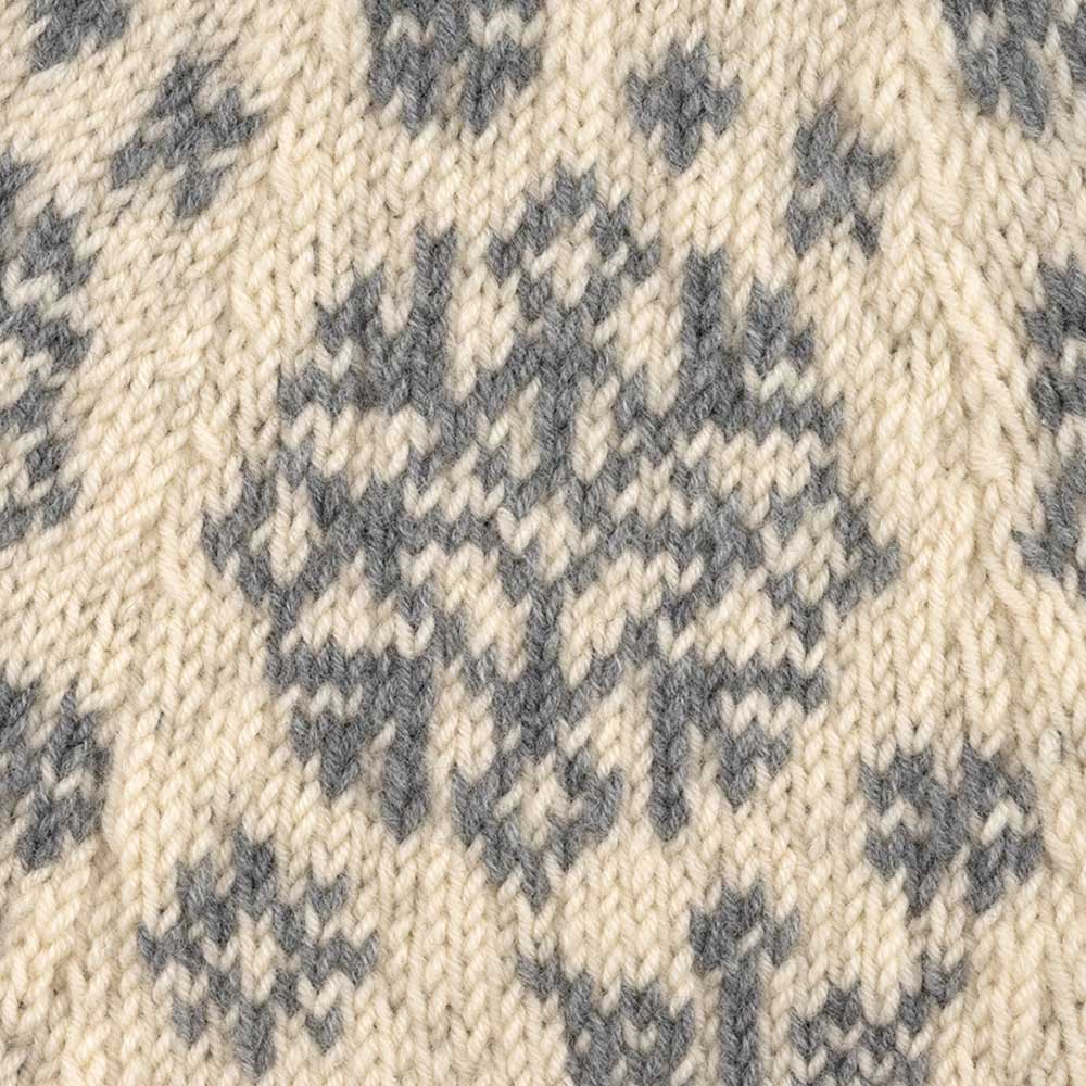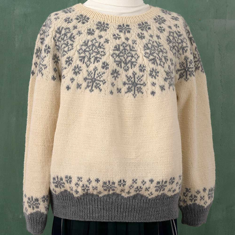 【作り方つき】繊細なスノーフレーク模様の編み込みプルオーバーです。前後見頃・袖それぞれに仕上げ、拾い目してヨーク部分を編みます。中?上級の方にお勧め。