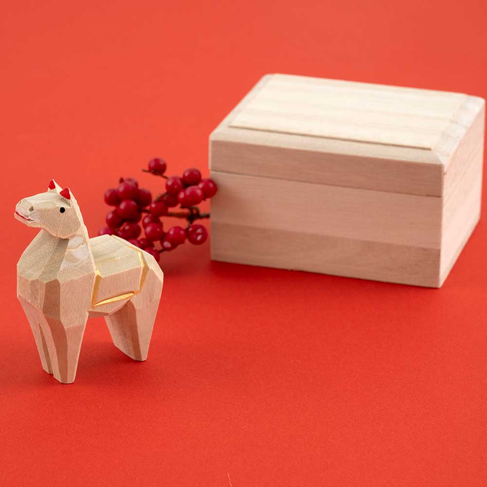 厄除けの象徴ともされるクスノキを一刀彫で力強く削り、白木の素地を生かして仕上げた午の置物です。特別感のある桐箱に入れてお届けします。