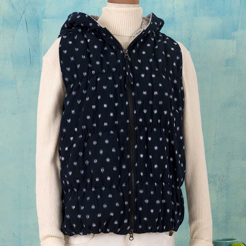 【完成品】表地に久留米絣、裏地にニットを使い、中綿を入れて暖かく仕上げたフードつきのおしゃれなベスト2柄です。アームホールがゆったりと動きやすく、ポケットが両側についています。