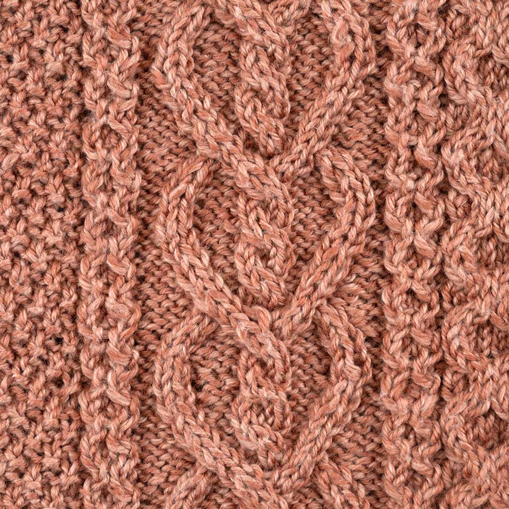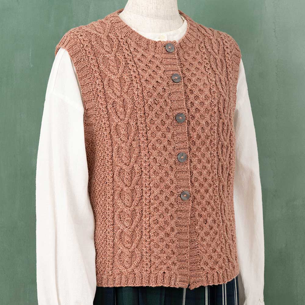 【キット作り方つき】【単品糸購入可】ハートのようなアラン模様がポイントの前開きのベストです。流行に左右されず年代も問わないデザイン。肌触りのいい綿混糸を使用します。上級の方向き。 コットン混なので肌触りがよく、秋のはじめから着られます。上級。