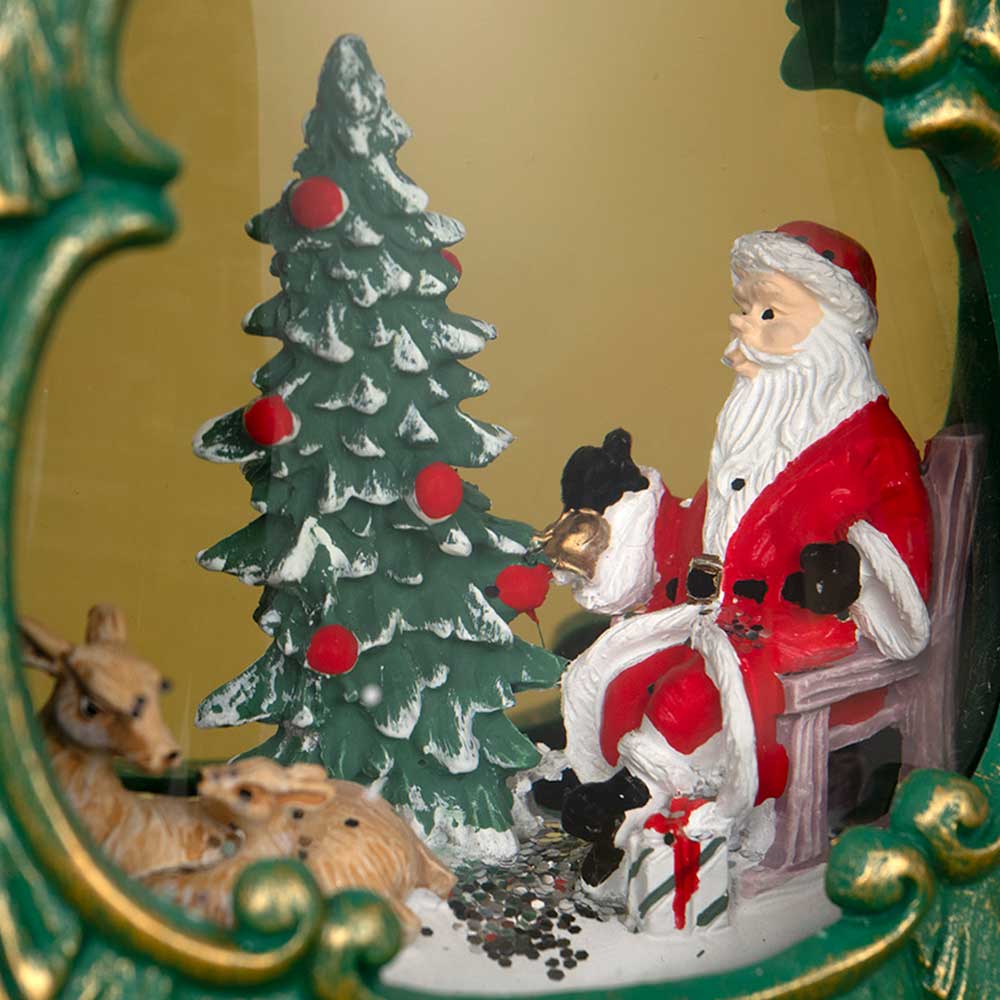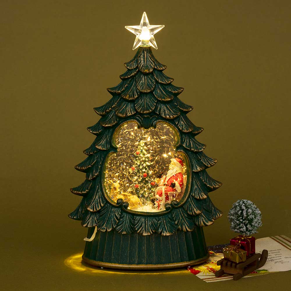 スイッチを入れるとラメが舞ってきらきら光る、シックな雰囲気のツリー型スノードームです。薄型で場所を取りません。