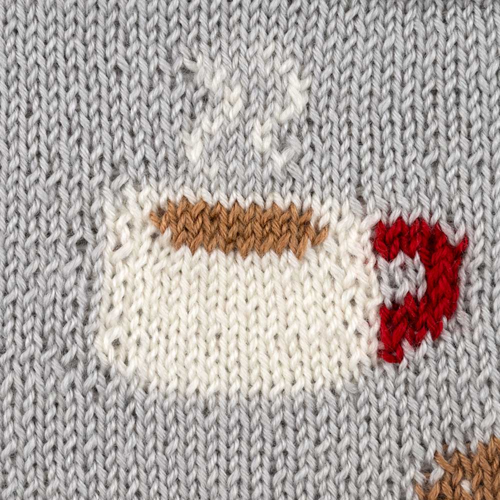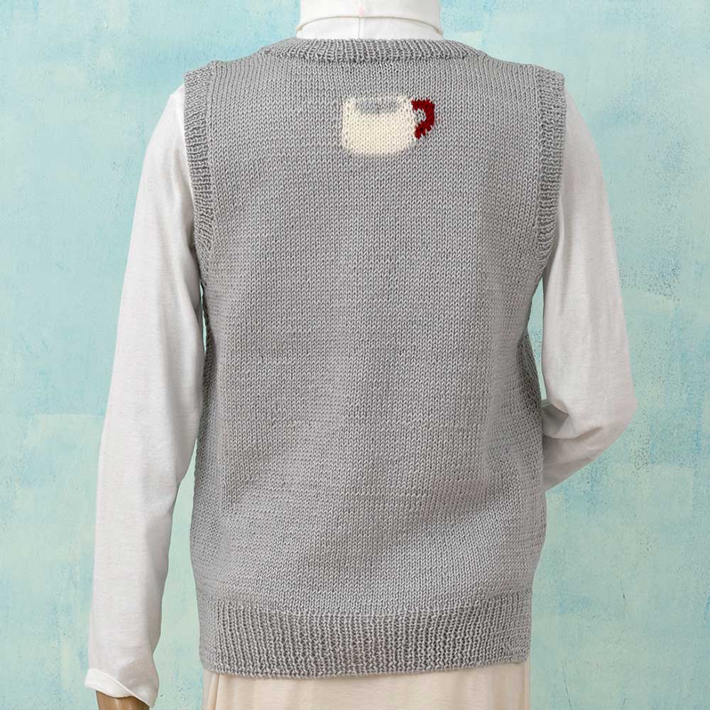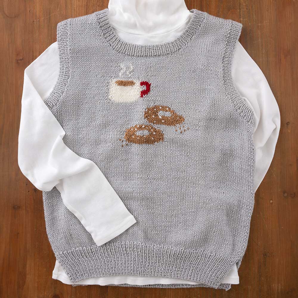 【キット作り方つき】【単品糸購入可】コーヒーとドーナツの編み込み模様が楽しいベスト。ドーナツにはステッチを少し加えて仕上げます。柔らかい糸で編むので着心地も抜群。中級の方にお勧めです。
