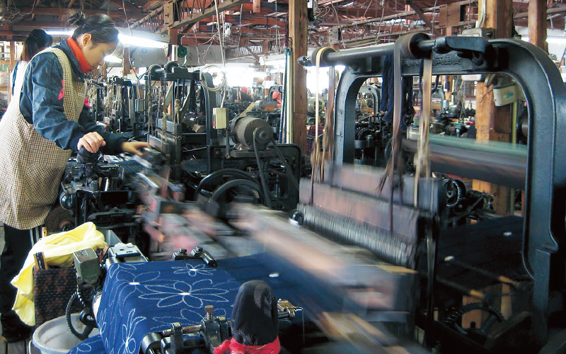 ▲くくり染めを施し、約30もの工程を経て古い織り機で織る
