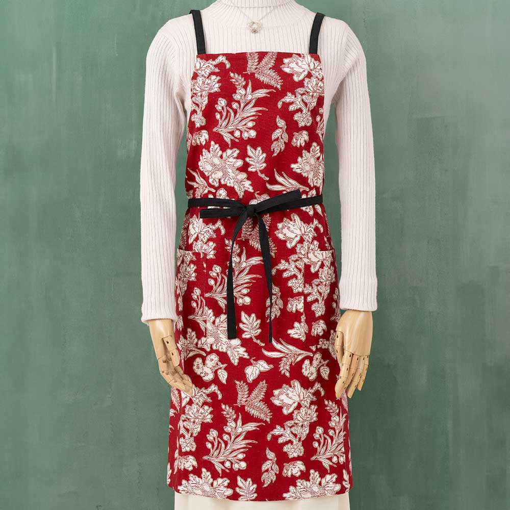 【完成品】麻混生地で使いやすいと人気のシリーズより、ノエルのシーズンにぴったりなノーブルなデザインのプリント生地を使ったエプロン。ひもは後ろでゆったりと結んでも、前に回してもOK。オーソドックスな使いやすい人気の形です。足さばきの良い短めの丈です。