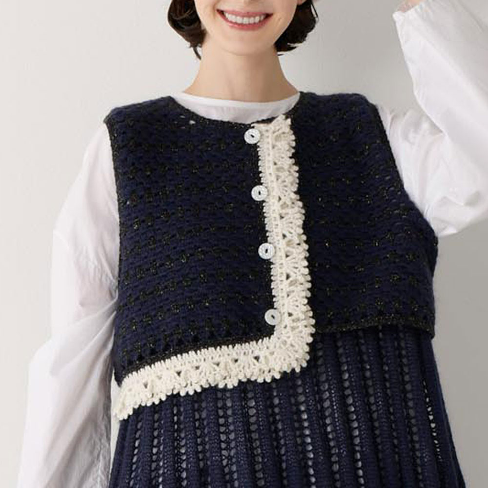 ガーリーなセットアップは、ベストはかぎ針編み、バルーンシルエットのワンピースは棒針編みとニュアンス違いの組み合わせ。アシンメトリーな前立てのフリルが目を惹くベストは、ストレートヤーンとスパンコール入りヤーンを縞にして、キラリと光るアクセントをプラスしています。フリル部分には熱で硬化する糸を引き揃えて形をキープ。