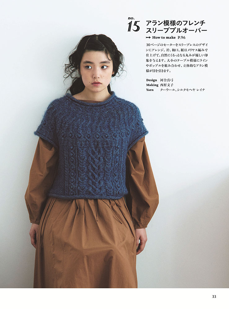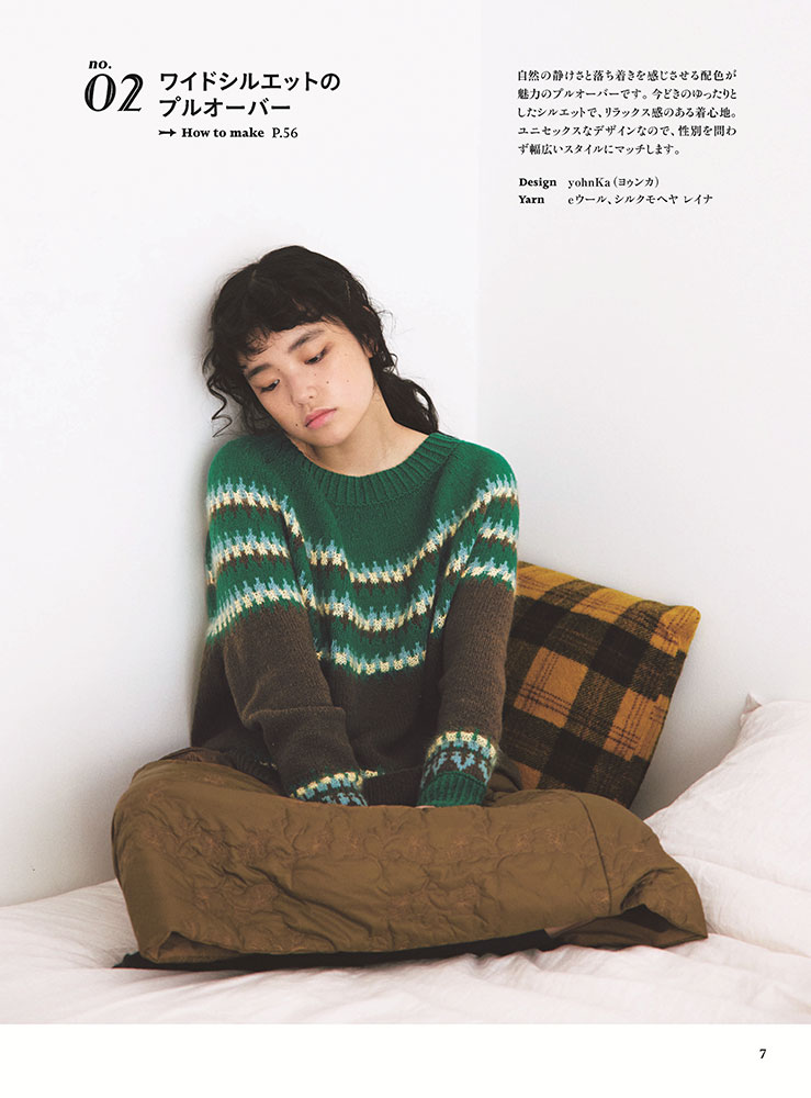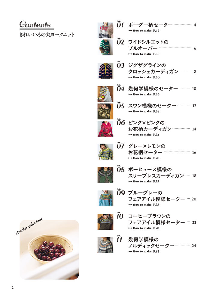 丸ヨークニットは身頃の肩・胸・背中を続けてぐるぐると円形に編まれた形状で、肩に継ぎ目がなく模様を効果的に編み入れることができるのが魅力! シンプルなボーダー模様のカーディガンからノルディック風の編み込みセーターから小物まで21点を掲載。MサイズとLサイズの2サイズつき。