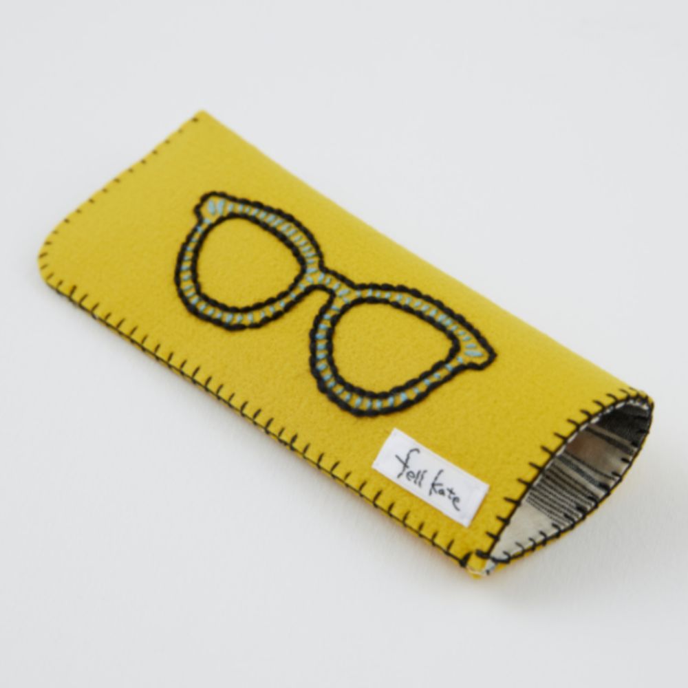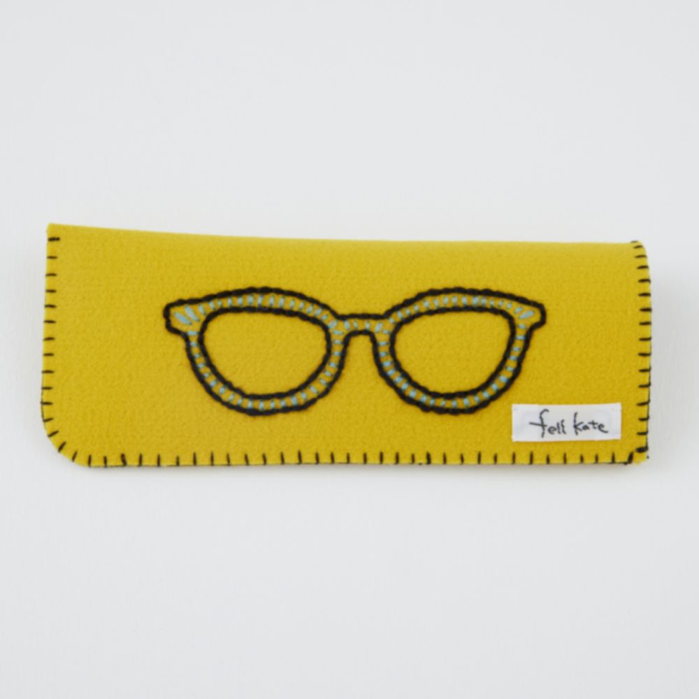 フェルトに毛糸で刺すメガネモチーフの刺しゅうがとってもおしゃれ。プレゼントにもぴったりです。
