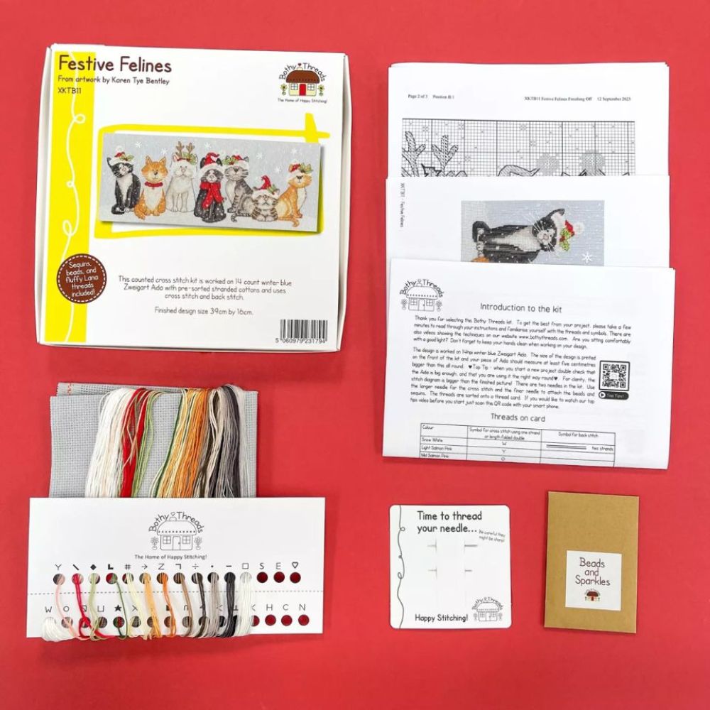 クリスマスのおめかしをしたネコたちの、にぎやかで楽しいクロスステッチキットです。