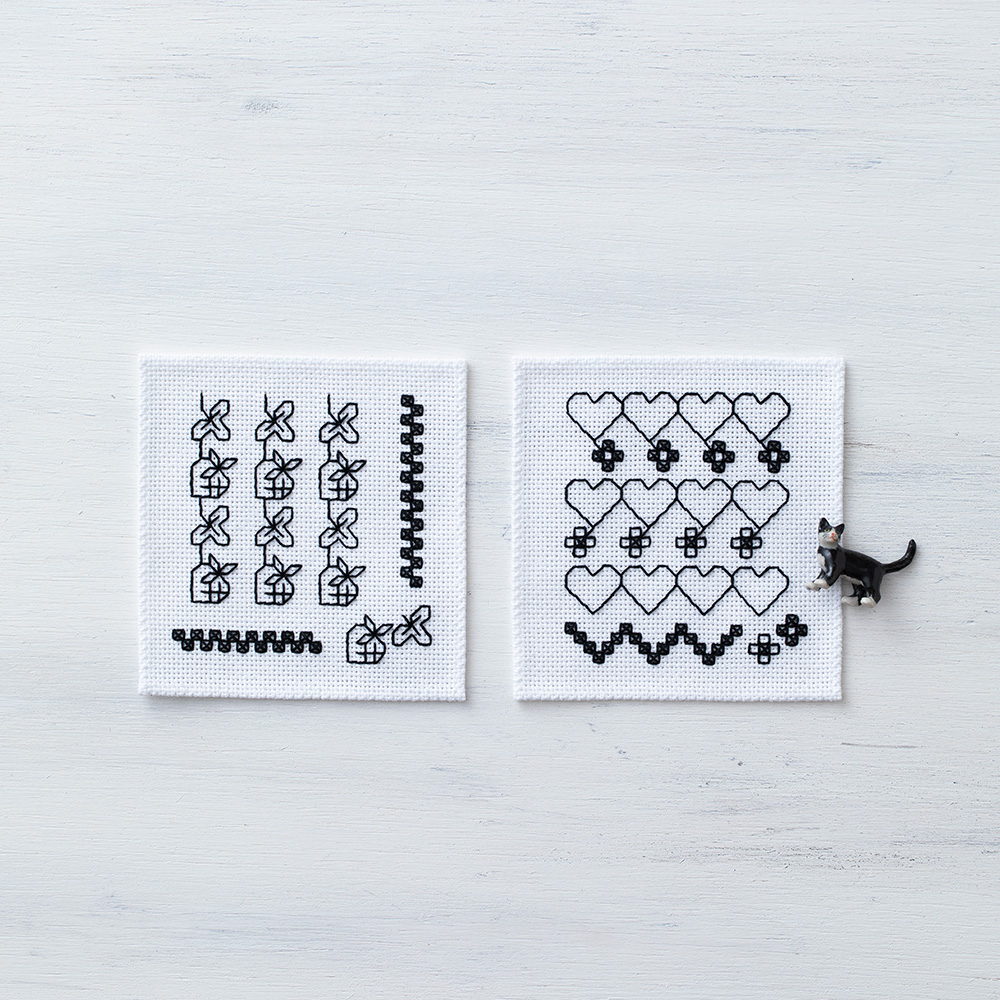 1つのパターンの刺し方、パターンをつなげるときの刺し方を学びます。ハートやイチゴなど親しみやすい形を刺して、針の進め方のルールを覚えましょう。活用しやすいクロスの刺し方も紹介します。